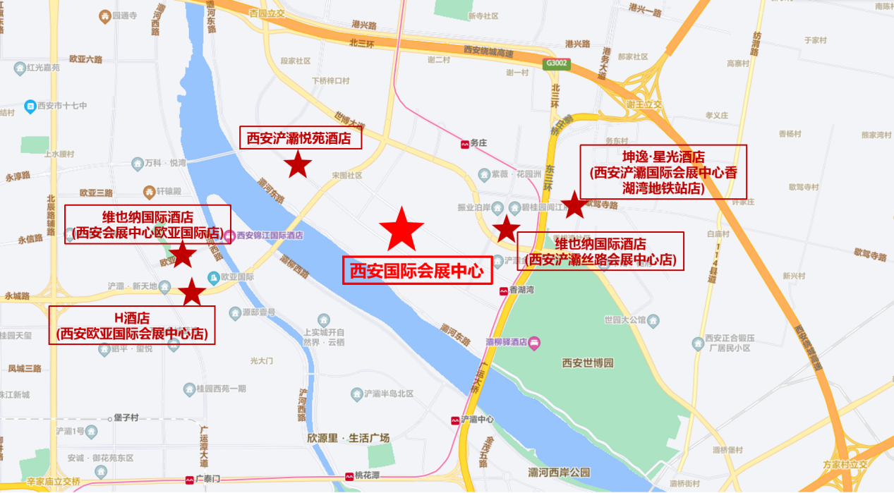 本次会议协议酒店有:西安浐灞悦苑酒店、维也纳国际酒店(西安浐灞国际会展中心店)、H酒店(西安欧亚国际会展中心店)、维也纳国际酒店(西安会展中心欧亚国际店)、坤逸·星光酒店(西安浐灞国际会展中心香湖湾地铁站店) ,房间数量有限,请于2024年5月24日前预订。